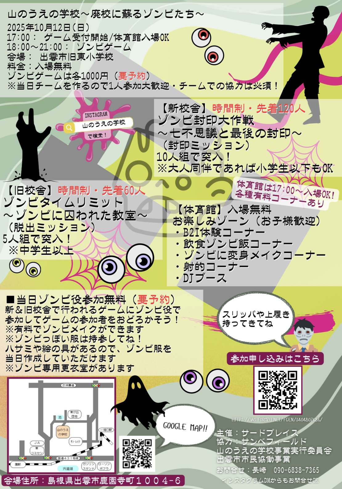 山のうえの学校~廃校に蘇るゾンビたち~は、出雲市鹿園寺町にある旧東小学校で夕方から行われるイベント。体育館で行われるお楽しみゾーンは入場無料。