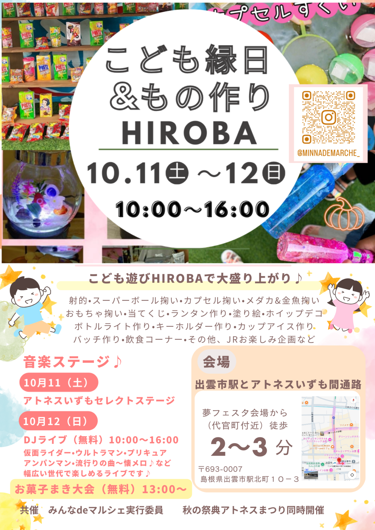 また、出雲市駅とアトネスいずもの間の道路では、10月11日・12日に、こども縁日&もの作りHIROBAが開催されます!