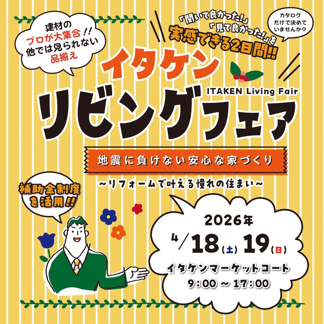 2026年4月18日・19日の9:00~17:00に、イタケンリビングフェアが行われます!