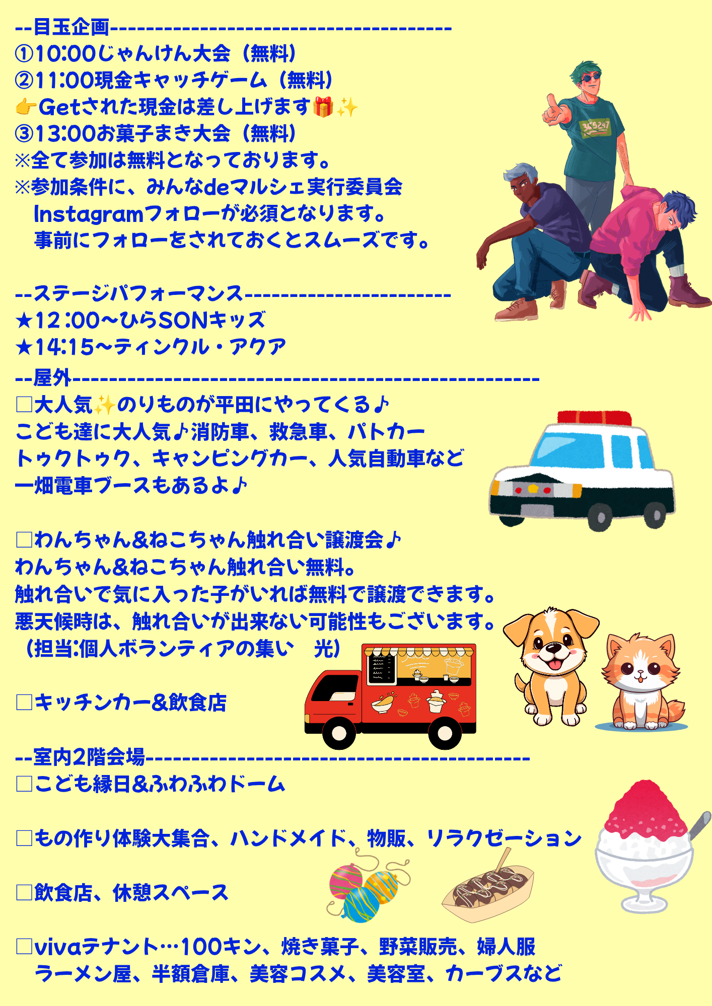 など。ほかにも無料のじゃんけん大会・現金キャッチゲーム・お菓子まき大会やひらSONキッズダンスやティンクルアクアダンスのステージパフォーマンスもあります。